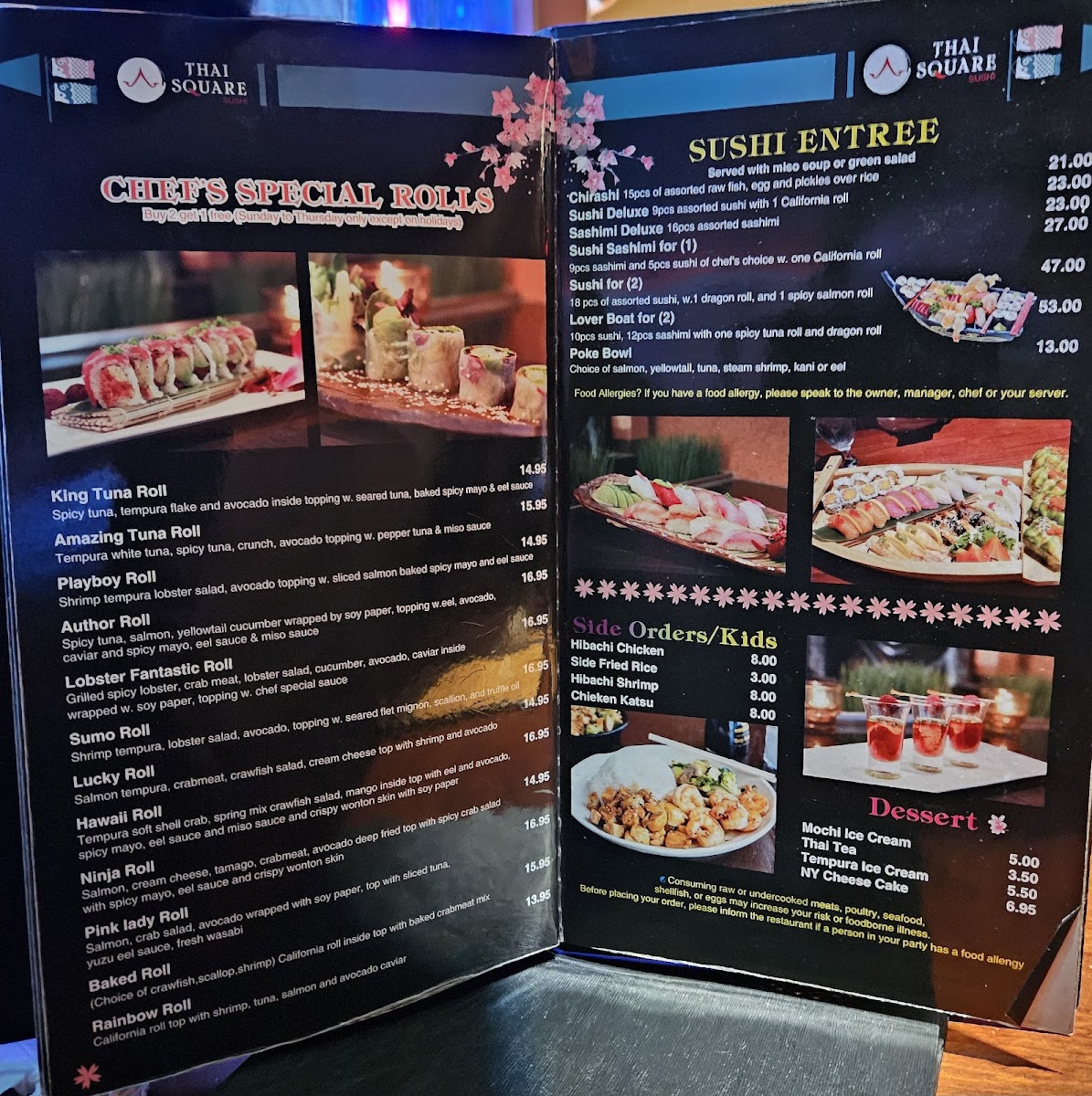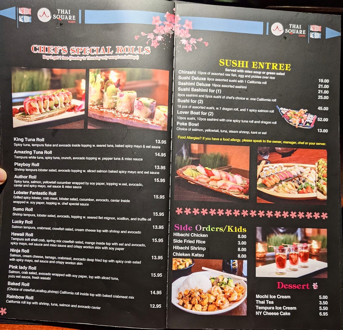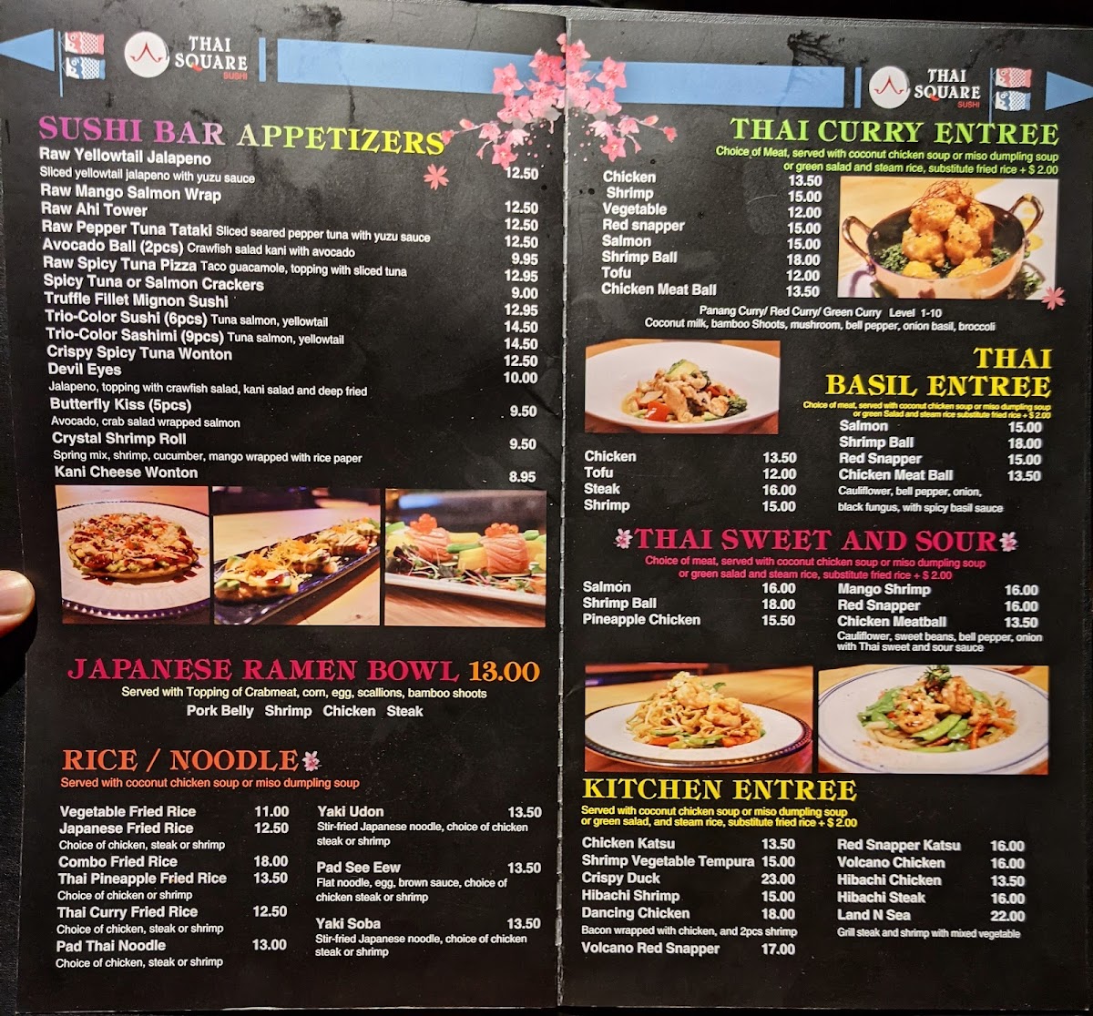 From No Spicy to Extra Extra Spicy. Sides: Miso Dumpling Soup, Coconut Chicken Soup, Onion Soup, or Salad.
